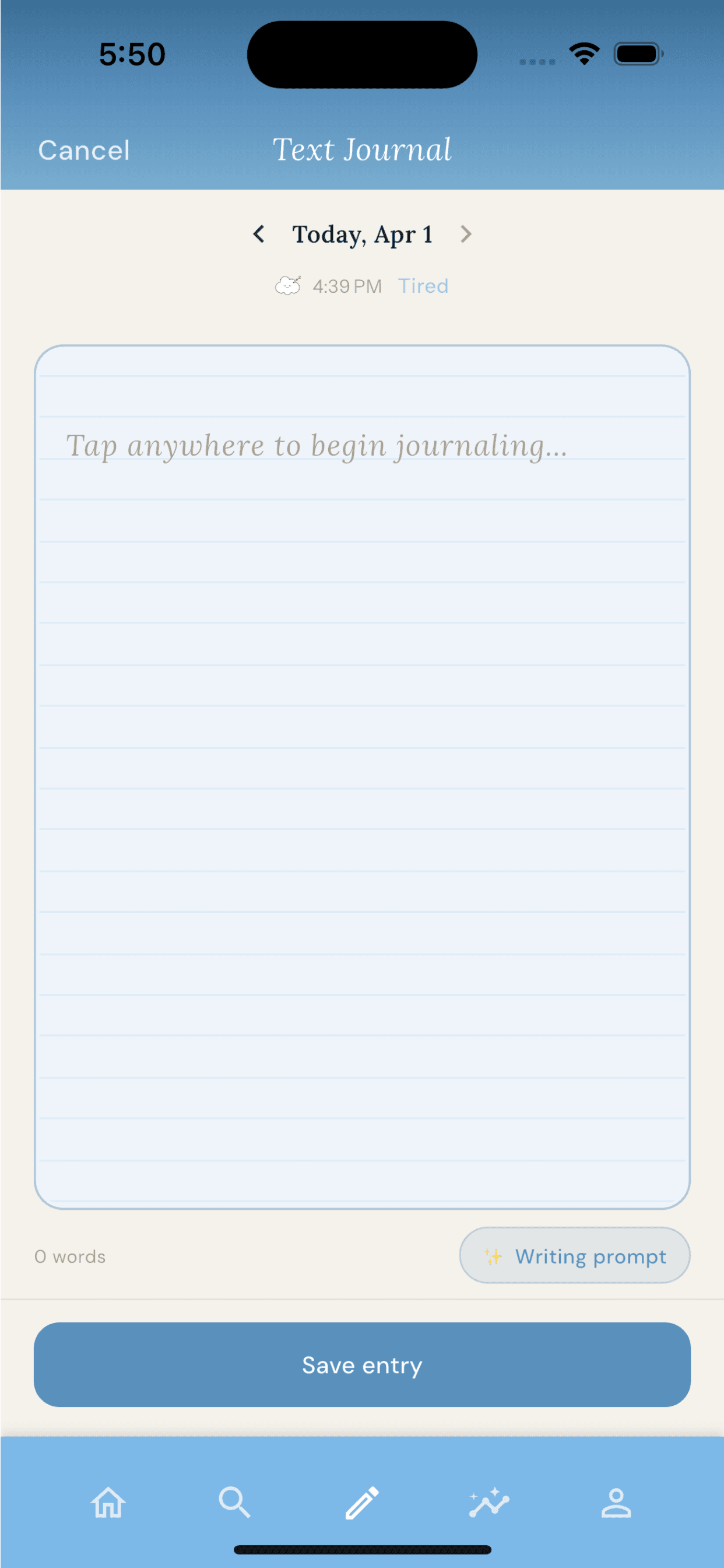 Lost in Thought is built around calm, intentional journaling, to help sort through your thoughts. Writing prompts help when words won't come. Mood tracking shows your emotional patterns over time. And AI is used only where it genuinely helps, never to replace the act of reflection itself.
