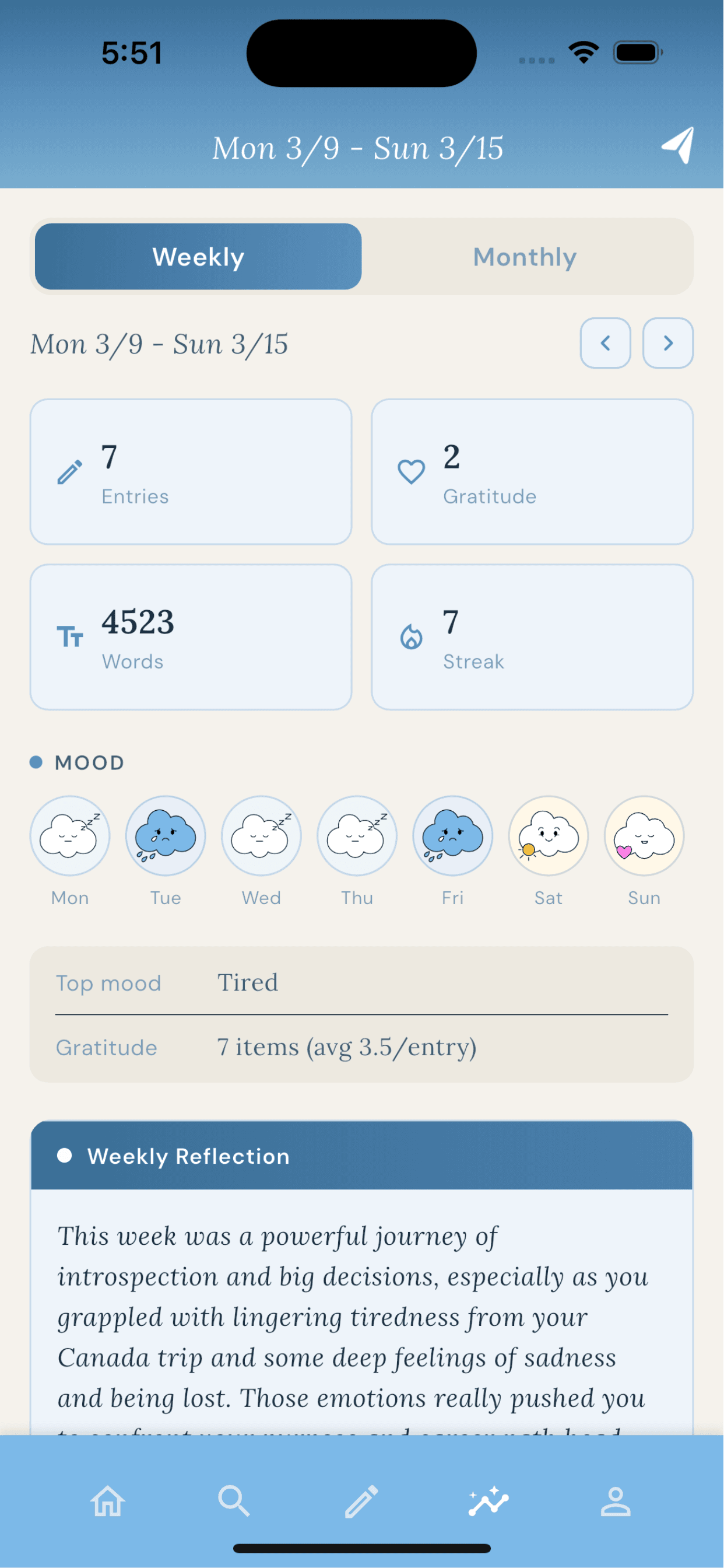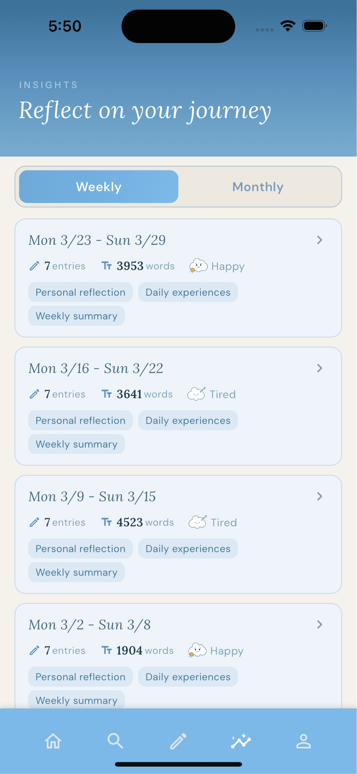 - Weekly and Monthly summaries surface your patterns